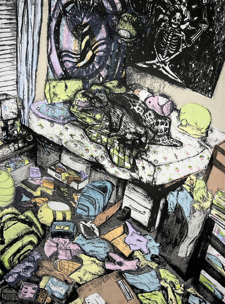 I work primarily in lithography and screen printing, drawing inspiration from personal experiences, mental health, and major life transitions.
